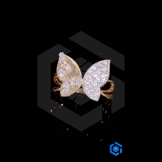 Introducing the Asymmetrical Wing Diamond Butterfly Ring. This captivating piece balances the rich warmth of polished gold against the dazzling fire of a full diamond pave wing. The contrasting textures create a bold, modern look while celebrating the classic symbol of transformation and freedom. A unique piece for a unique soul.