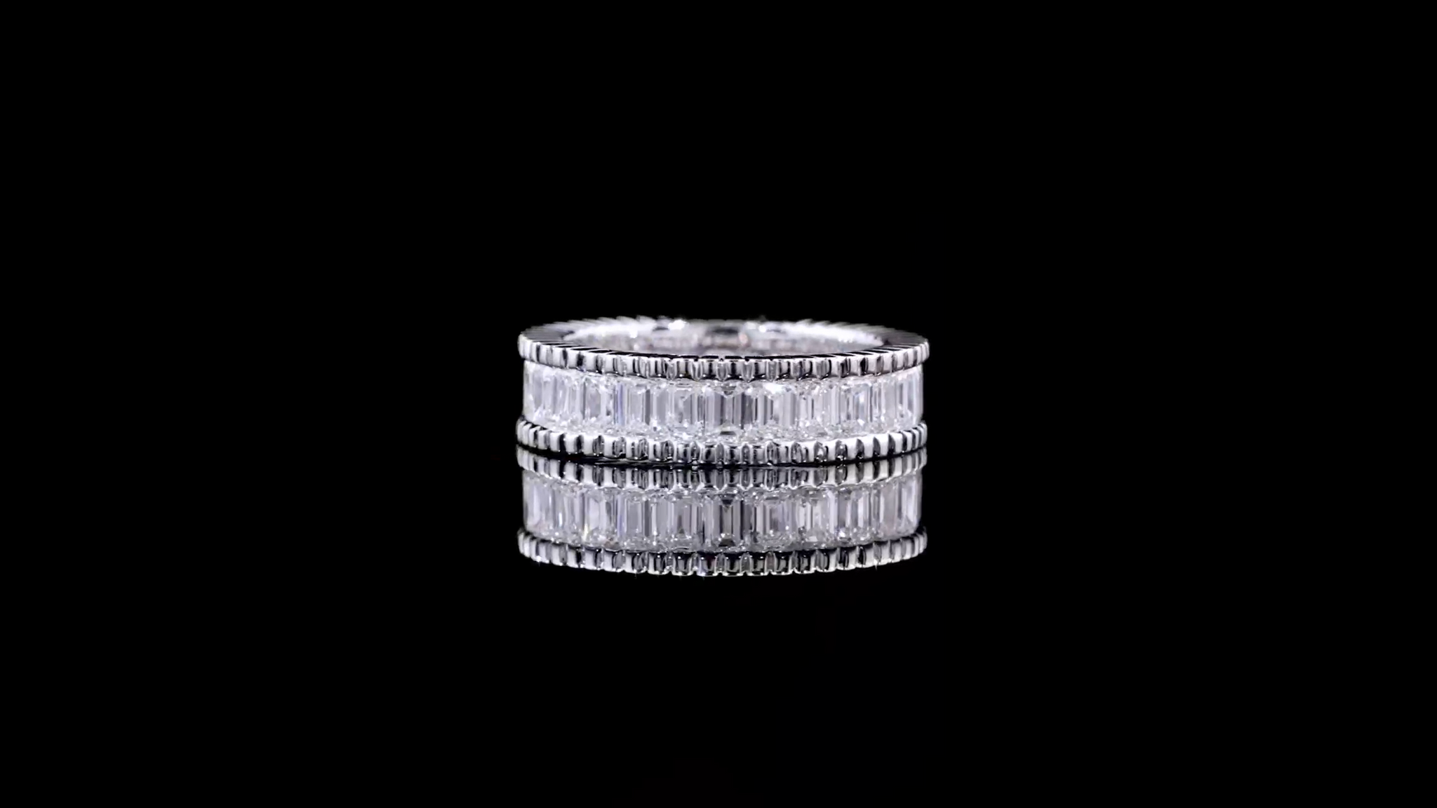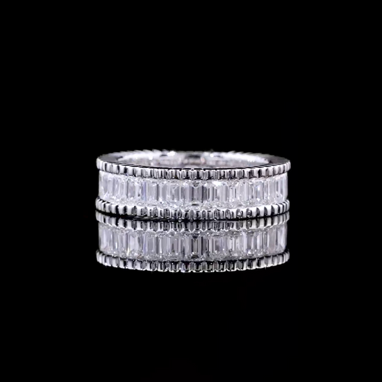 A true statement of architectural beauty — this diamond band features rows of meticulously matched baguette stones, each set to reflect light with sharp, mirror-like precision. The intricate edgework enhances its bold structure, creating a ring that embodies both luxury and craftsmanship. A radiant symbol of sophistication, crafted to stand apart.