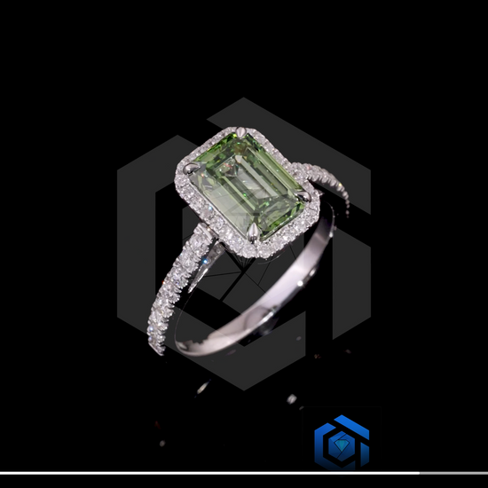 Emerald-cut green diamond halo ring
