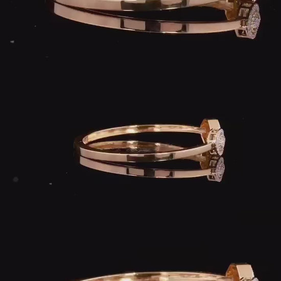 Make a statement with a pop of color. This rose gold open ring features a vibrant, logo-etched ruby centerpiece framed by a shimmering halo of diamonds. Modern luxury at its finest.